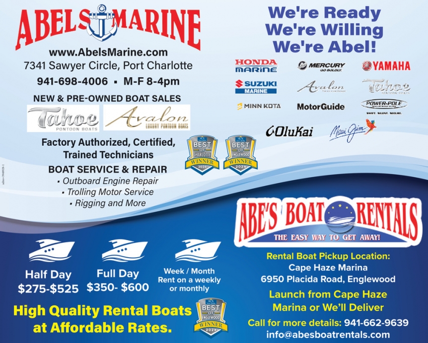 Jan 23, 2025. Abel's Marine - Abe's Boat Rentals Marine Ads from Your Sun