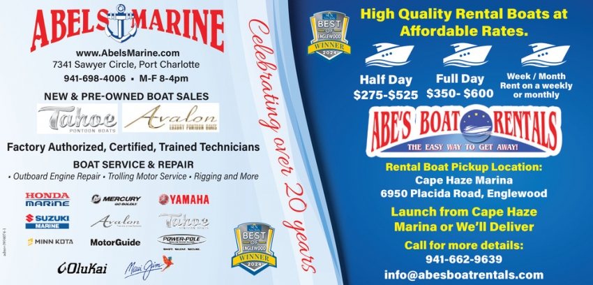 Aug 27, 2024. Abel's Marine - Abe's Boat Rentals Marine Ads from Your Sun