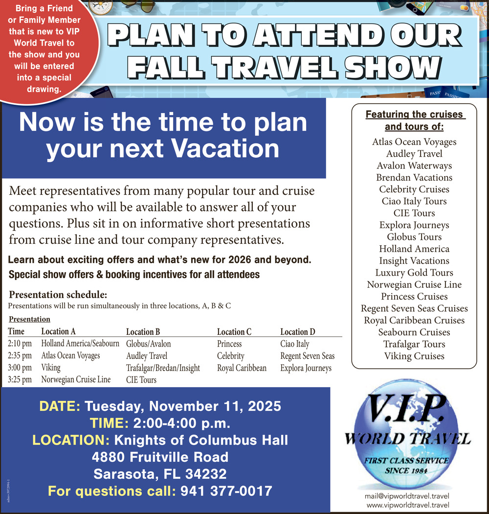 Ads for V.I.P. World Travel Fall Travel Show (November 11, 2025) in Sarasota, FL