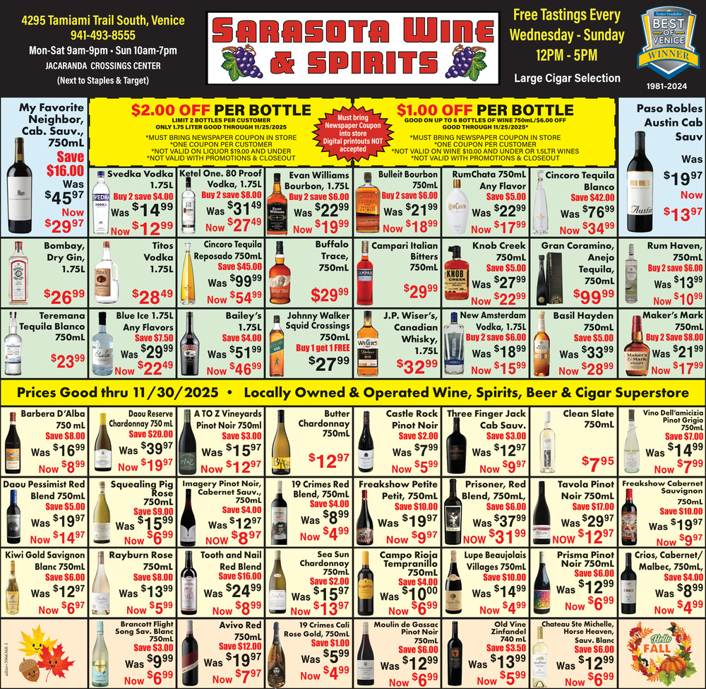 Nov 19, 2025. Sarasota Wine & Spirits Liquor Ads from Your Sun
