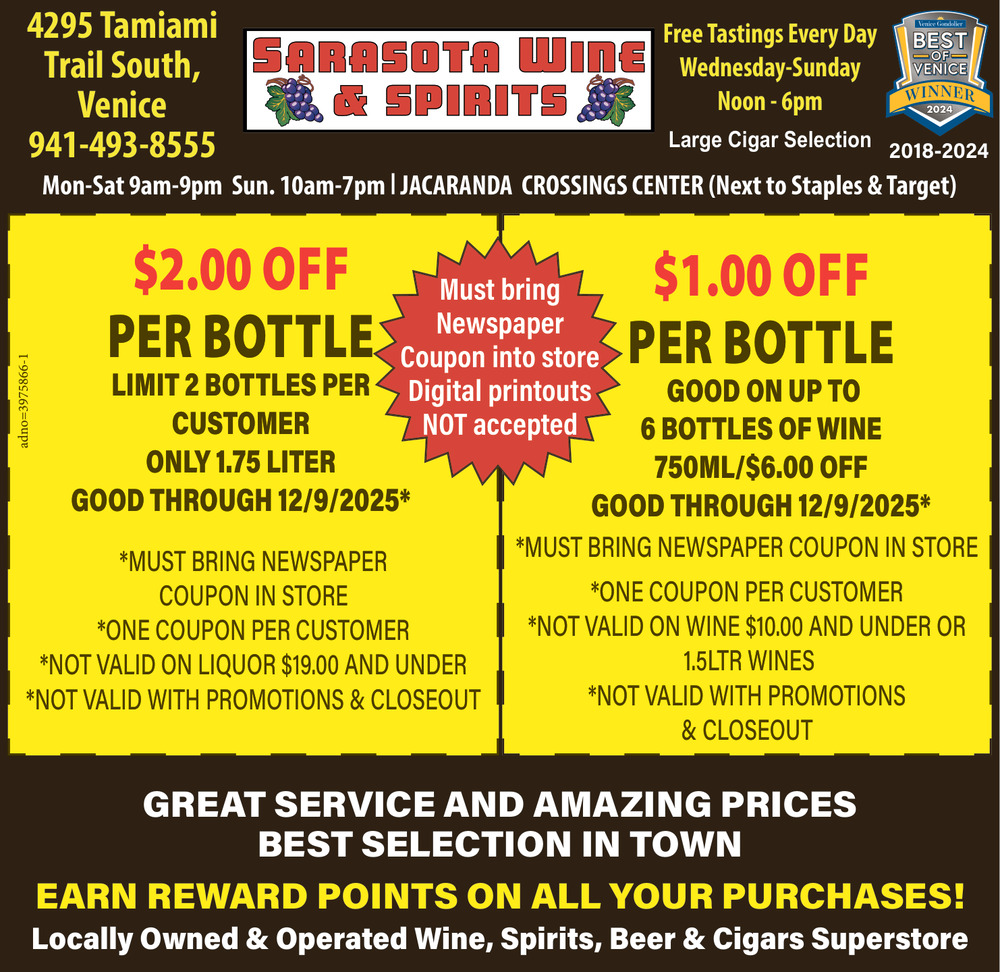 941-493-85554295 S Tamiami TrailVenice, FL 34293(Sarasota Wine & Spirits)