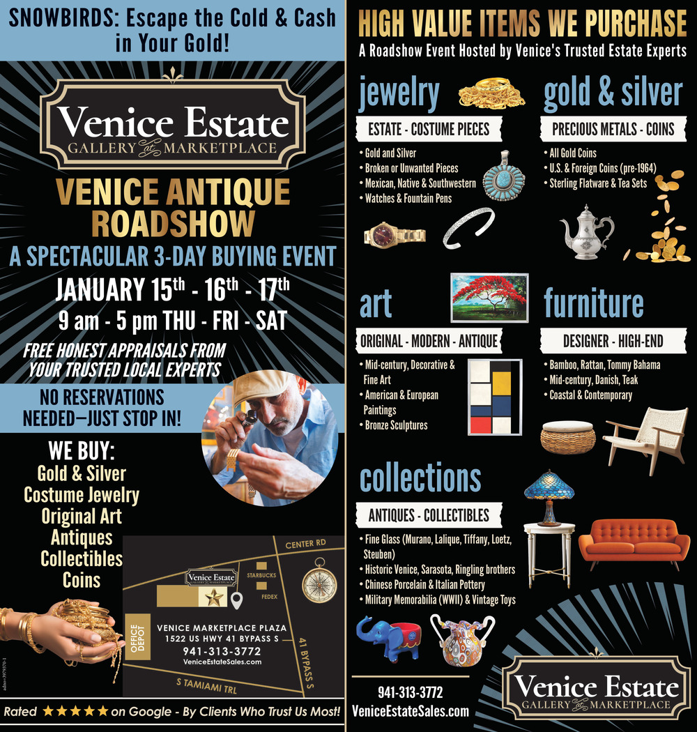 Ads for Venice Estate Gallery & Marketplace Roadshow (November January 15-17, 2026) in Charlotte, DeSoto and Southern Sarasota County