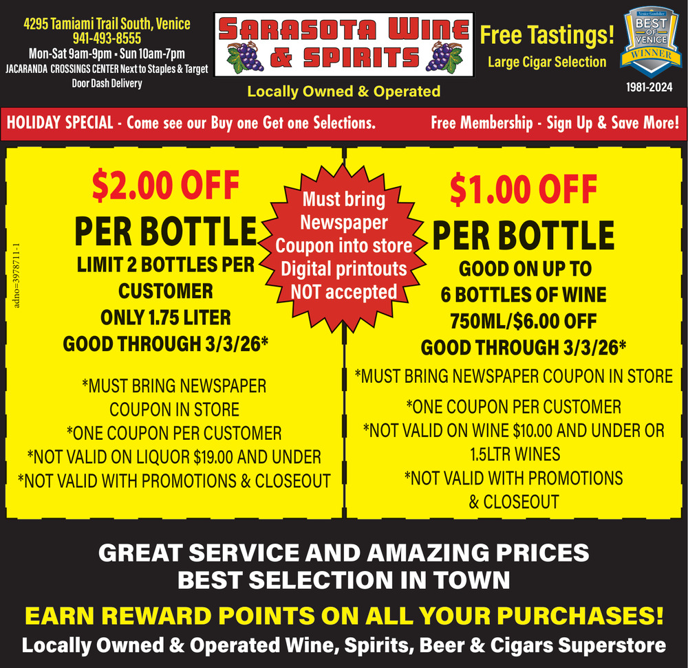 941-493-85554295 S Tamiami TrailVenice, FL 34293(Sarasota Wine & Spirits)