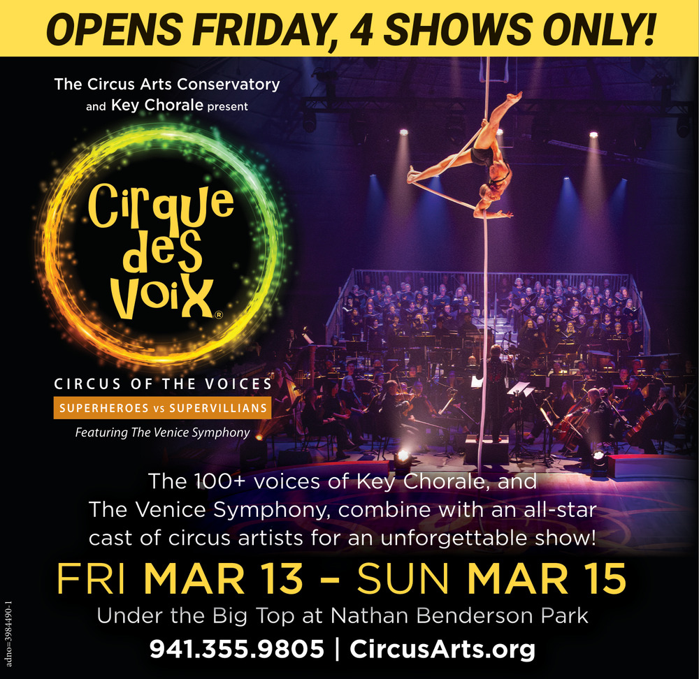 Ads for Cirque Des Voix (March 13-15, 2026) in Charlotte, DeSoto and Southern Sarasota County