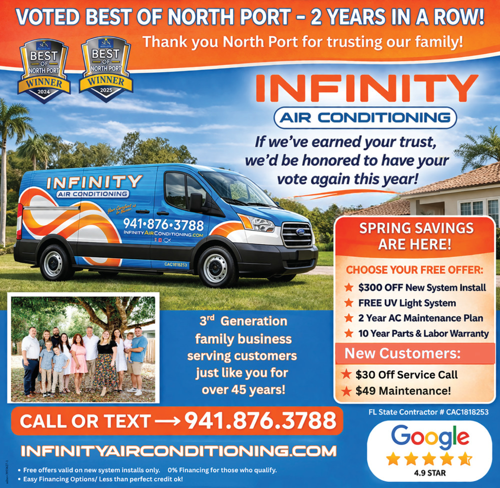 Ads for Infinity Air Conditioning in Charlotte, DeSoto and Southern Sarasota County